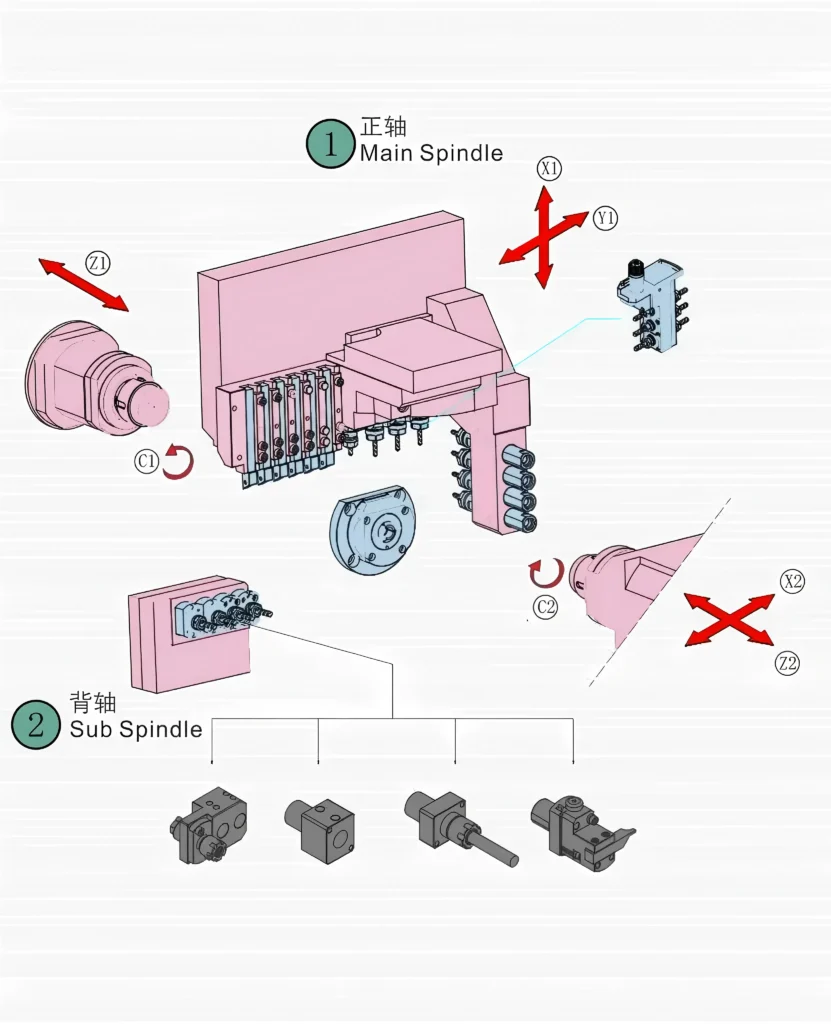 Traditional CNC lathe: use a turret with a relatively limited number of tools and usually only one tool works at a time. The sub-spindle is an optional configuration and many economical models do not have this function.
