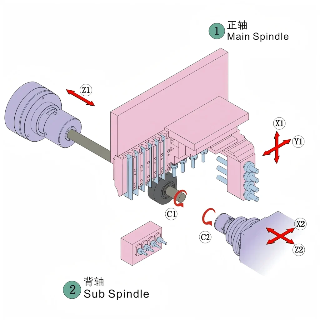 CNC Swiss lathe: Adopt a multi-position powered tool post layout surrounding the spindle. These tool posts can work simultaneously or sequentially and are equipped with a sub-spindle. After the main spindle completes machining at one end of the workpiece, the sub-spindle takes over and immediately begins machining at the other end that finishes all operations in a single setup.
